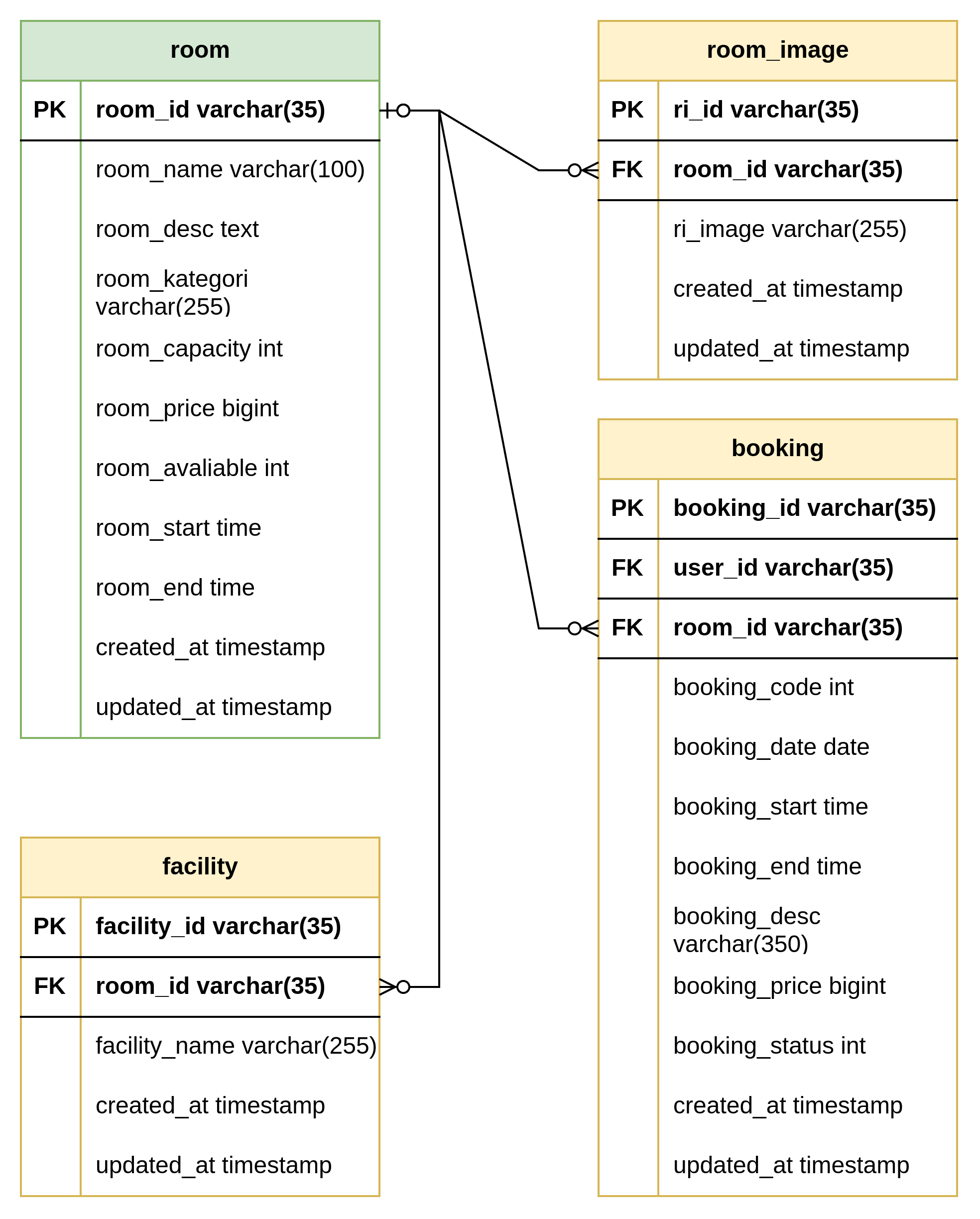 - room_facility : room (1) - room_facility (M)